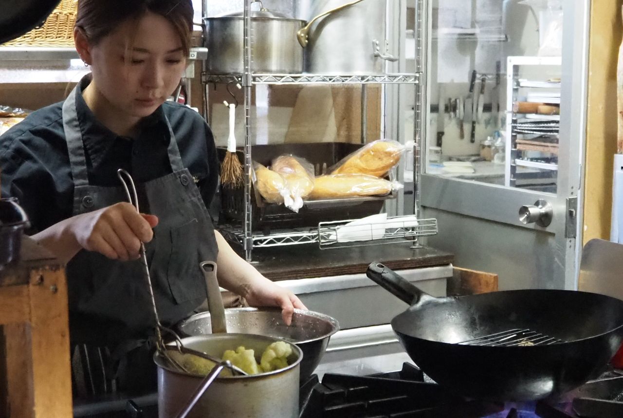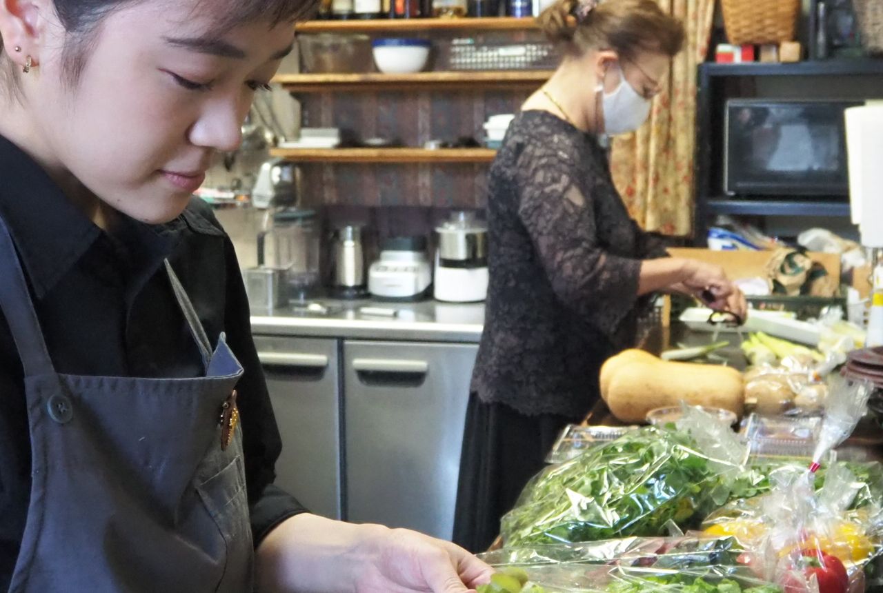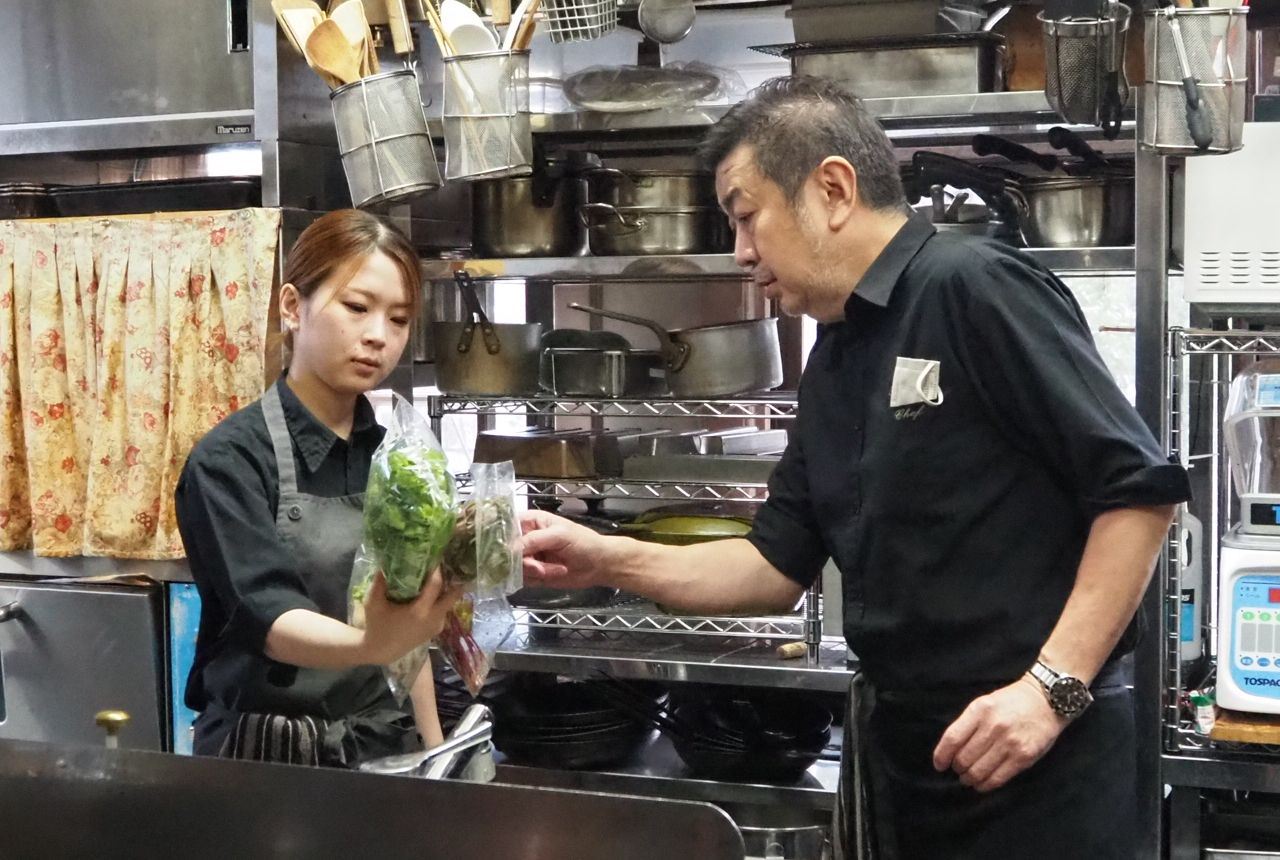 別の産地直売所へ買い出しに行っていたマダムの恵子さんと、掃除を終えたソムリエの宮崎智帆さんが厨房の手伝いに来ました。「4人しかいないので総力戦です(笑)」と恵子さん。宮崎さんは奥田さんと同じ高校の同級生で、やはりボンヴィヴァンに勤めて8年目。「宮崎はソムリエですが、魚も下ろすし、お菓子も作れます。接客に優れているので、僕ら夫婦も安心してホールを任せています」と河瀬さん。誰一人抜けてもボンヴィヴァンにならないと、スタッフを惜しみなくほめるのが印象的です。