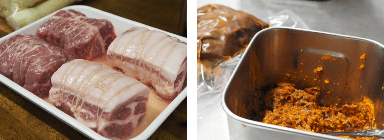 この日のランチは愛知県からの団体客で満席。前々から予約が入っていたので、大きな仕込みは前日に済ませていました。左は伊勢志摩のブランド豚・パールポークの肩ロースを米こうじでマリネしているところ。右は松阪牛のバラ肉で作ったミートソースと、松阪牛のほほ肉をデミグラスソースで煮て真空パックしたもの。