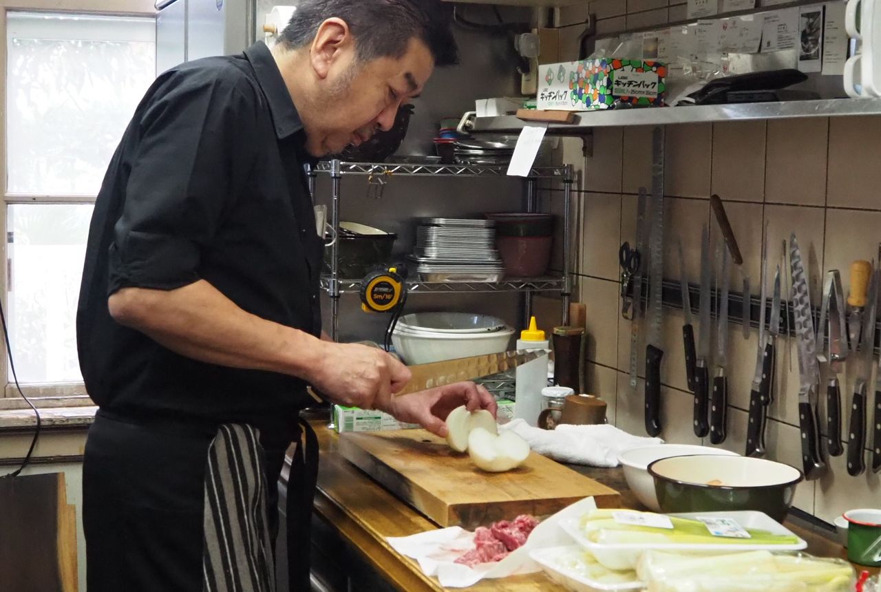 河瀬さんがたまねぎを刻み、朝のまかないを作り始めます。店では朝のまかないをシェフが、夕方のまかないをスタッフが作ります。10人以上の大所帯だった頃から続いている習慣です。「僕がスタッフを指導するうえで一番大事だと思っているのは、舌を育てること。つまり味覚を磨くことです。切ったり煮たりといった手順は料理書にも書いてある。でもおいしい料理を食べないと舌は育ちません」