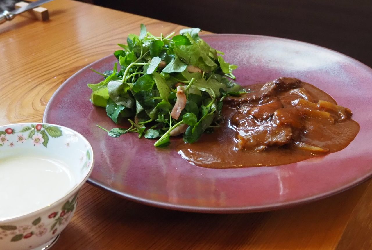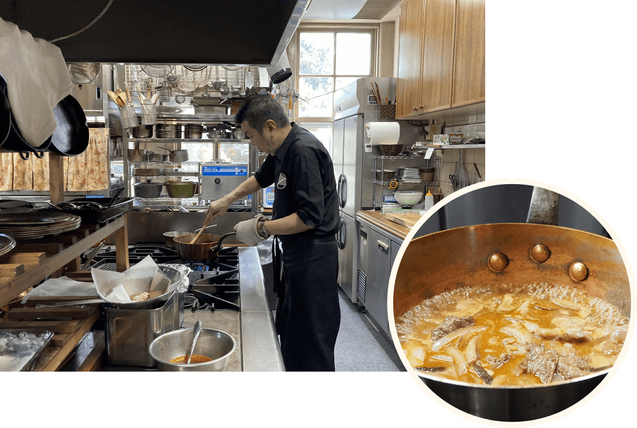 この日のまかないメニューは、ハッシュドビーフ、ベビークレソンとローストポークのサラダ、和栗のスープ。「お客さまに提供する食材と同じものを使います。まかないといえども手を抜きません」。まかないは日によってフレンチ、イタリアン、和食、中華とジャンルを変えるそうです。松阪牛とたまねぎのスライスをデミグラスソースで煮込んでいる鍋から、何ともいえず良い香りが漂ってきます。