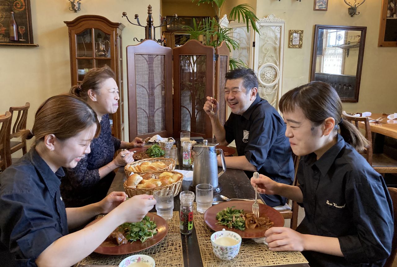 いつも客席にきちんとついて、お客さま用の皿とカトラリーでまかないを食べるそうです。「自分たちが提供している料理やサービスはこういうものだと、場の雰囲気も含めて体感してほしいから」と河瀬さんは言います。食事をしながら、恵子さんがその日の予約客のプロフィールやサービスの注意事項を、河瀬さんがコースメニューの内容を伝えます。打ち合わせが終わると、しばしなごやかに談笑。まかないのひとときは、チームワークに欠かせないものとなっています。
