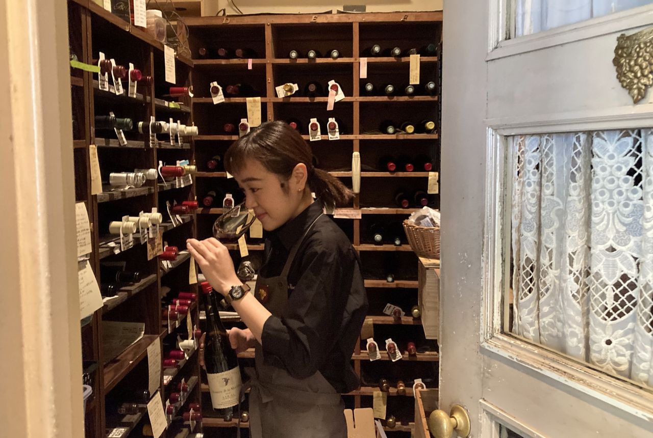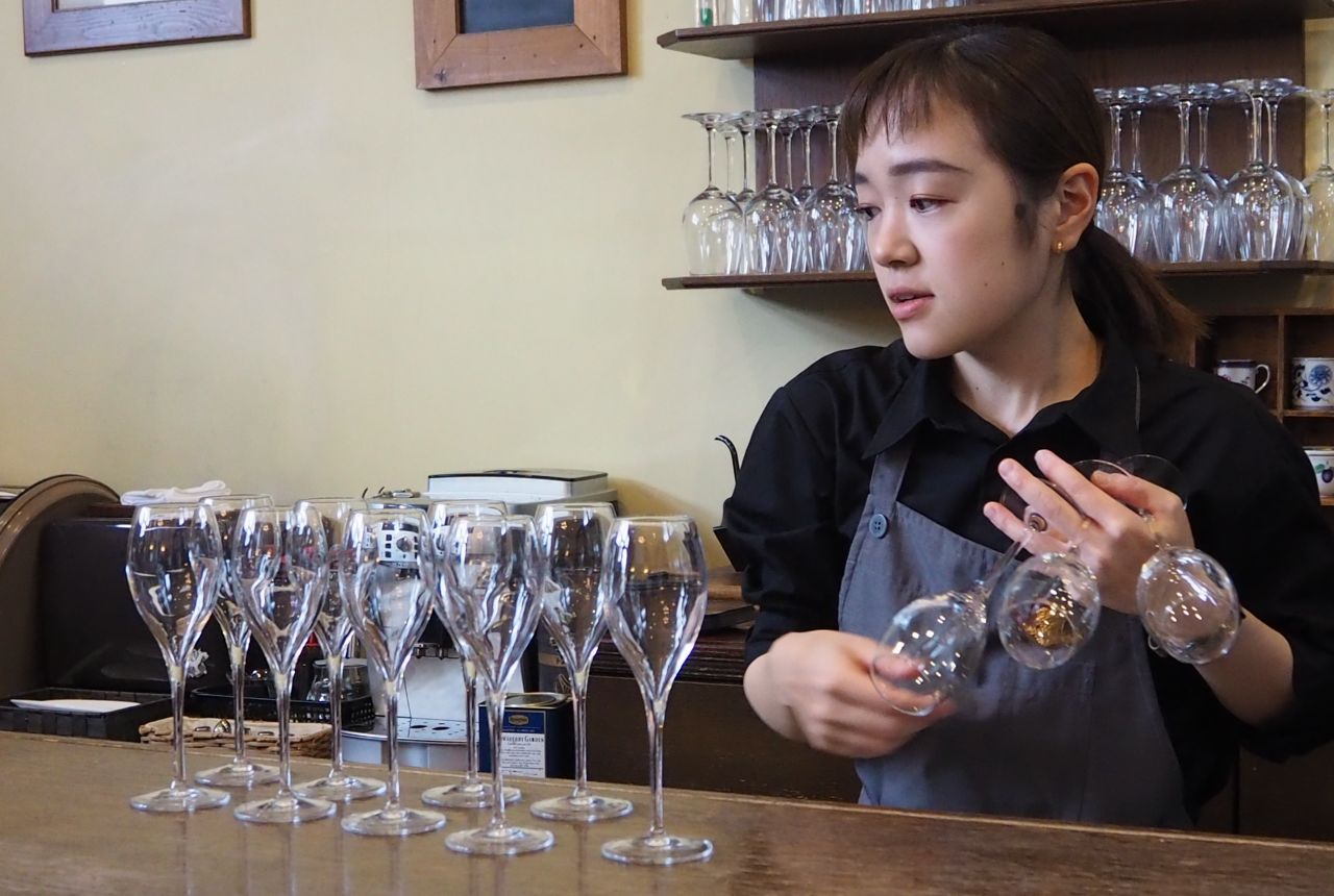食事を終えたら、各自の持ち場に戻ります。宮崎さんはワイン庫で、在庫チェックとグラスワイン用に栓の開いた赤ワインの品質チェック。続いてウェルカムドリンクのグラスを用意します。