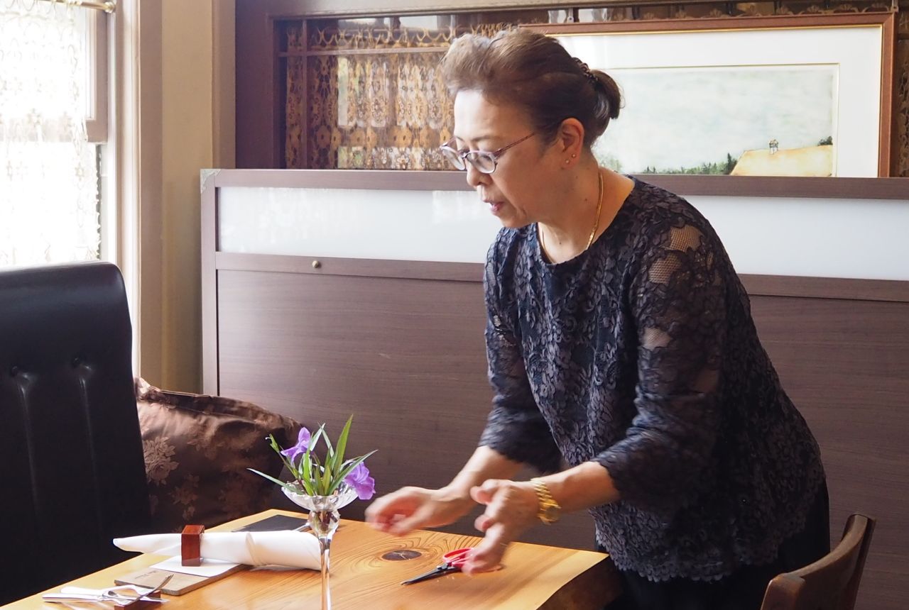 恵子さんは各テーブルの花活け。洋館の中庭で摘んだ薄紫色の花の名は「伊勢花火」というそうです。