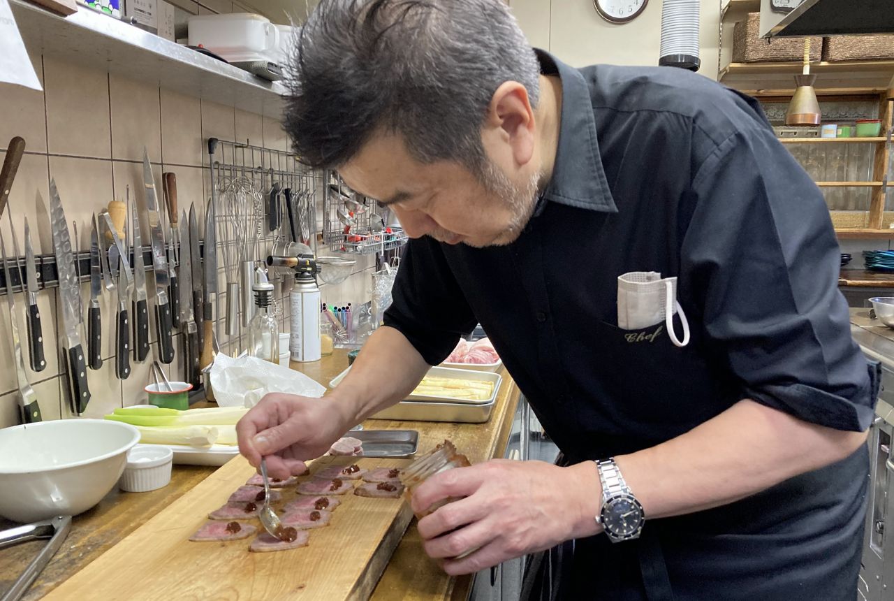 河瀬さんは別の前菜を仕上げ中。赤ワインで煮た松阪牛のほほ肉のスライスに松阪牛のミートソースを塗っています。間もなく慌ただしい昼営業がスタートします。ボンヴィヴァンの朝は、スタッフ一丸となって最高の料理とサービスを提供するための大切な準備時間です。