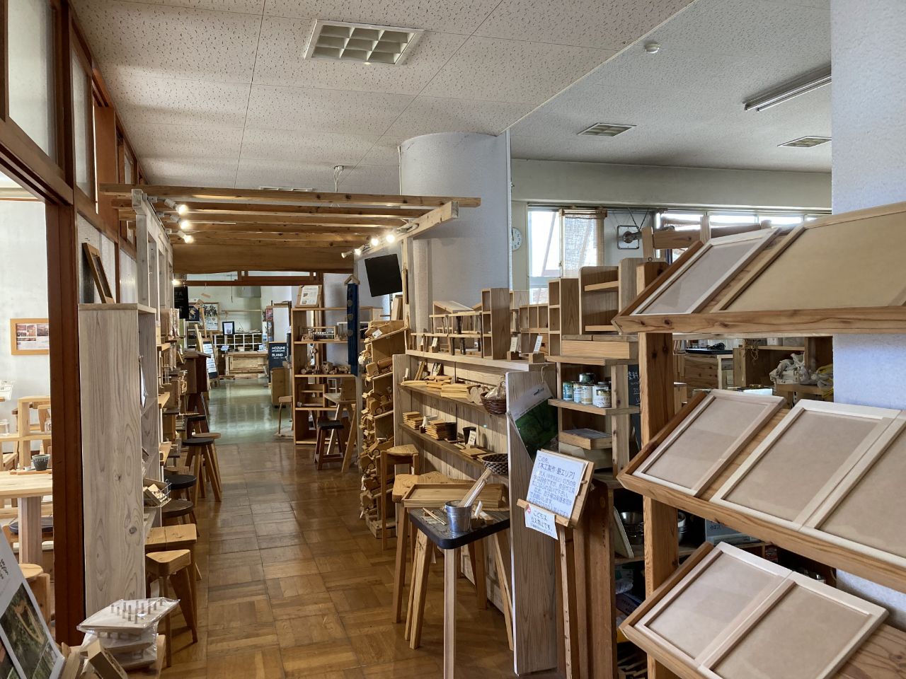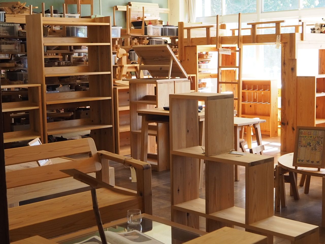 施設に足を踏み入れると、かぐわしい木の香りに包まれました。見回すと、廊下にも複数の元教室にも、溢れんばかりに木工品が飾られています。多種多様な展示品は、薄井さんが設計図を描き、未経験から育成したアルバイトスタッフ数名が製作したもの。大きな家具から箸入れのような小物まで、すべて栃木県産のスギ・ヒノキ材でつくられています。館内は開館中いつでも見学することができ、展示品を自由に物色して購入することが可能です。オーダーメイドの相談もできるそうです。