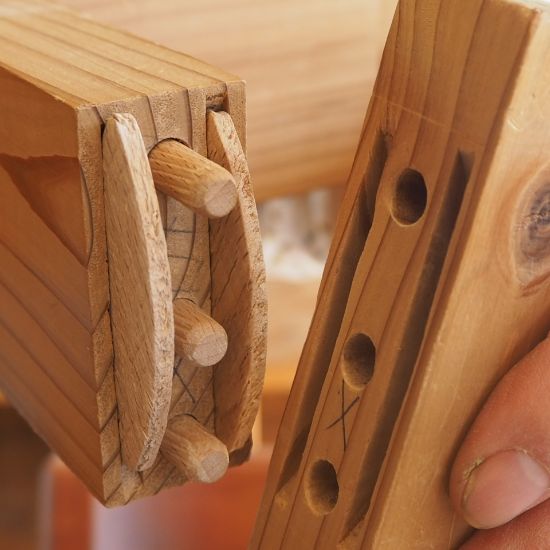 「簡単すぎ木工」と名付けたそれは、曲げやせん断力(物体内部にズレを生じさせる力)を多数の接合材で分散伝達させる方法。橋の設計に携わっていた薄井さんによると、力の伝達原理は、巨大構造物も木工品も同じなのだそうです。釘やネジは一切使わず、棒状のダボ、ラグビーボールを平たくしたような形のビスケットという接合材を使用。同じ径の穴にこれらを差し込み、木工用ボンドでぴったり合体させて、木材同士をつなぎ合わせます。「スギ・ヒノキ材はやわらかいので、従来の方法で強い力をかけると、木組みがゆるんだり外れたりしてしまいます。一方、このように接合材の1つ1つに力を分散させると、強度と耐久性がぐっと高まるのです」