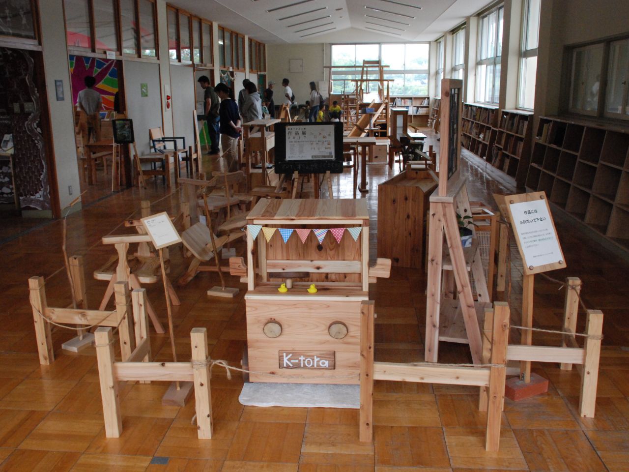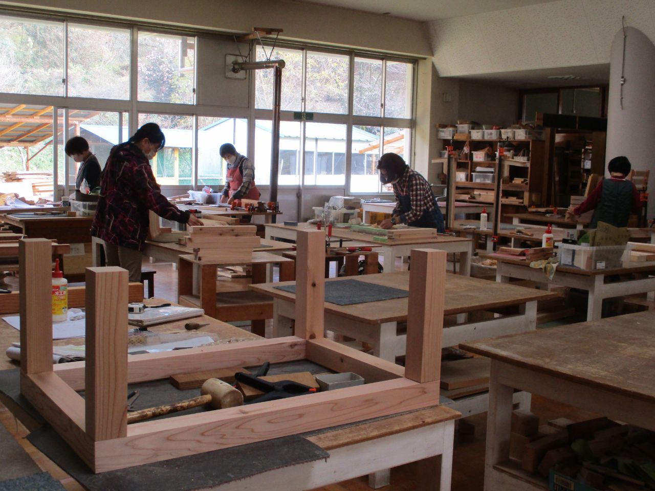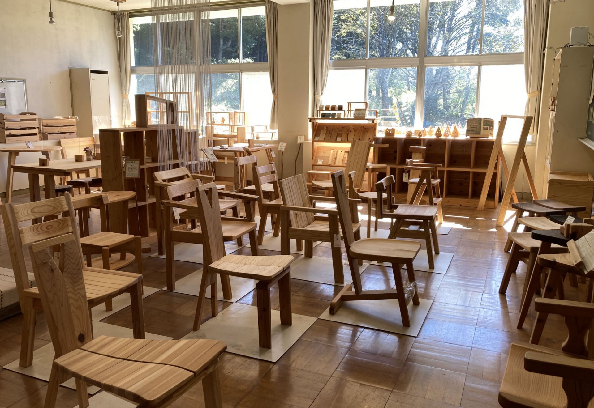 やわらかいスギ・ヒノキ材は、電動工具や木工機械を使えば、簡単に加工することができます。価格が安く入手しやすいことも魅力です。熟練を必要としない簡単すぎ木工を開発したことにより、人材育成がしやすくなったという薄井さん。地元の高齢者、主婦、障がい者などを積極的に育成し、アルバイト雇用しています。「おかげで大口注文に対応できるようになりました。ここ数年は、地元のレストラン、オフィス、幼稚園、観光施設などから大きな発注があり、利益が出るようになりました」。広大な廃校舎では、大型品を製作したり、一括納品のために在庫を大量にストックしたりすることが容易です。これはまさに廃校活用のメリットだといえるでしょう。