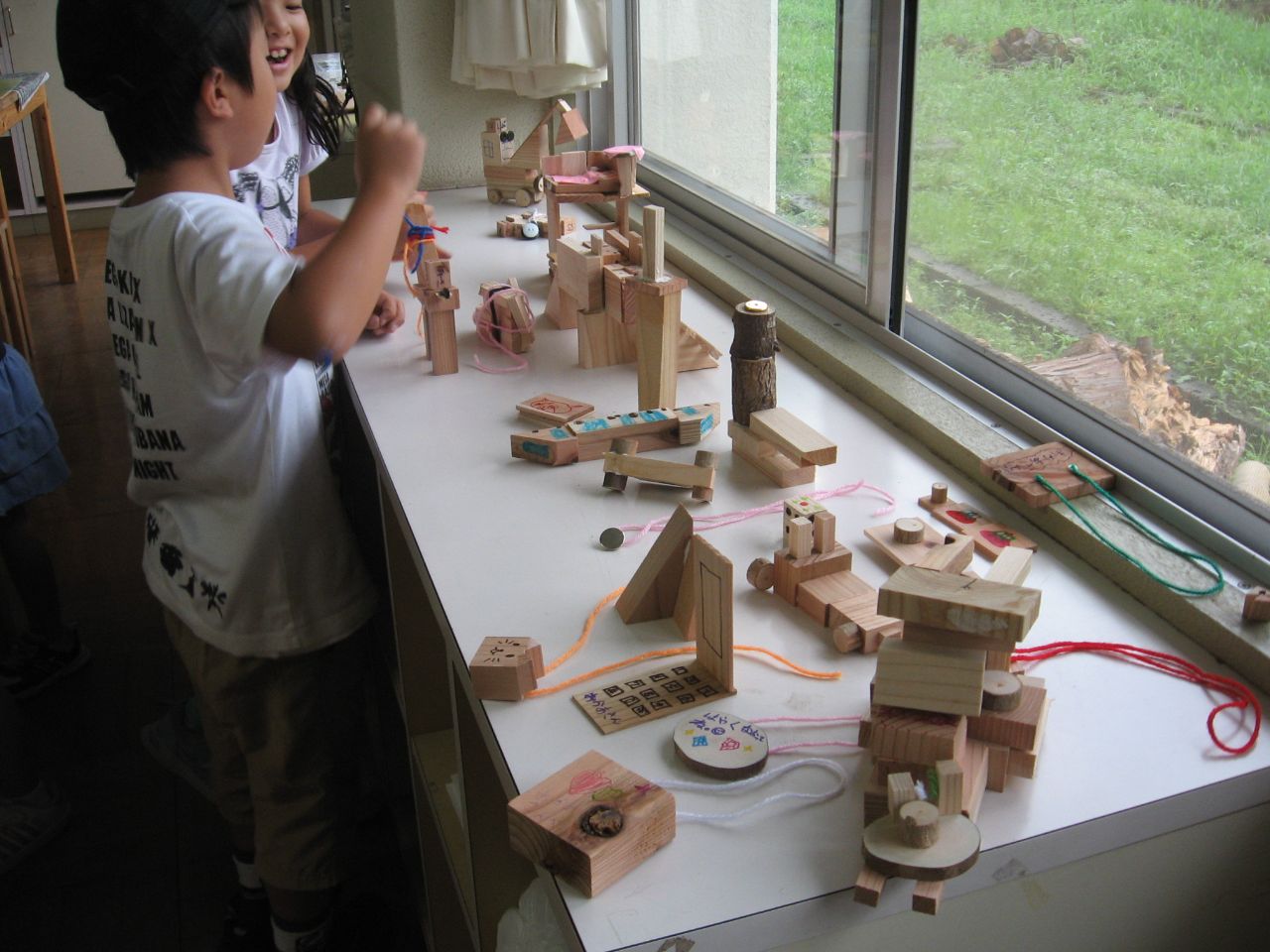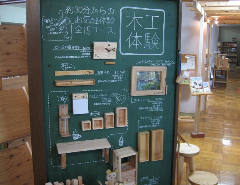 幼児から大人まで楽しめる木工体験は全15コース。フォトフレーム、ペンケース、スツール、小さい棚などいろいろつくれます。特に端材を使う木片木工コースはこどもに人気。形や大きさの異なる木片を自由自在に組み合わせる造形体験が、思考力と創造力を育みます。「家族でつくっているうちに、親御さんの方が夢中になっているというケースもよくあります」