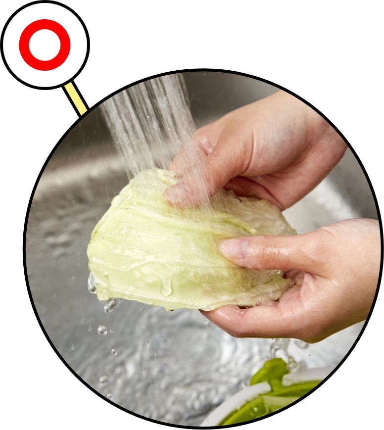 一方、野菜や果物は表面に汚れ等が付いている可能性があるため、流水で洗い流してからの調理をおすすめします。また、一尾ものの魚や殻付きの貝類を調理する際も水洗いしましょう。魚介類を汚染する腸炎ビブリオなどの食中毒菌は塩分のない環境では増えることができないため、流水でしっかりと洗うことが重要です。