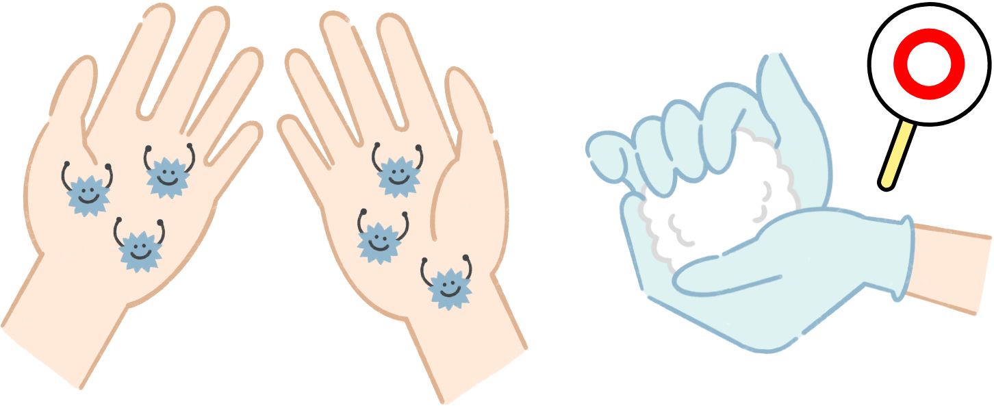 手洗い前の手の表面には、黄色ブドウ球菌という食中毒菌が存在しているため、手洗いをせず食材や調理器具に触れるのはご法度です。また、たとえ石鹸で手洗いしたとしても、その後、何気なく触れた食材等から細菌等に汚染されてしまう可能性も少なくありません。おにぎりや手巻き寿司などは素手ではなく、ラップなどを使って作りましょう。また、手に怪我をしている場合は、傷口に存在する黄色ブドウ球菌が食中毒を引き起こす可能性があるため、傷口が直接食品に触れないよう、使い捨ての手袋などを使うようにしましょう。