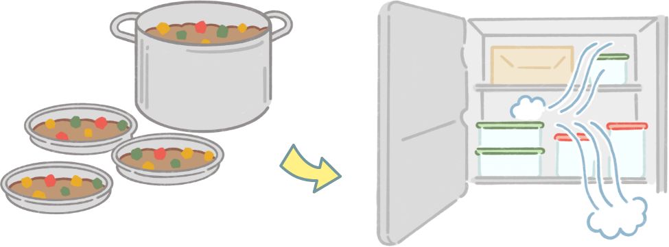 カレーやシチューなどの大鍋で大量に作る煮込み料理を保存する際は、短時間で温度が下がるよう、底の浅い容器に小分けして冷蔵や冷凍保存しましょう。保存した料理を食べる際は、全体を十分に加熱しましょう。