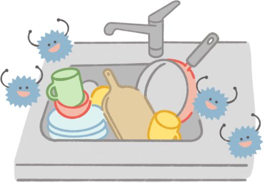 食後の食器や調理器具を長時間シンクで水に浸した場合、細菌等が繁殖する可能性があるため、できるだけ早く洗いましょう。また、シンク内や三角コーナーなども清潔な状態に保ち、キッチン全体を清潔に保ちましょう。