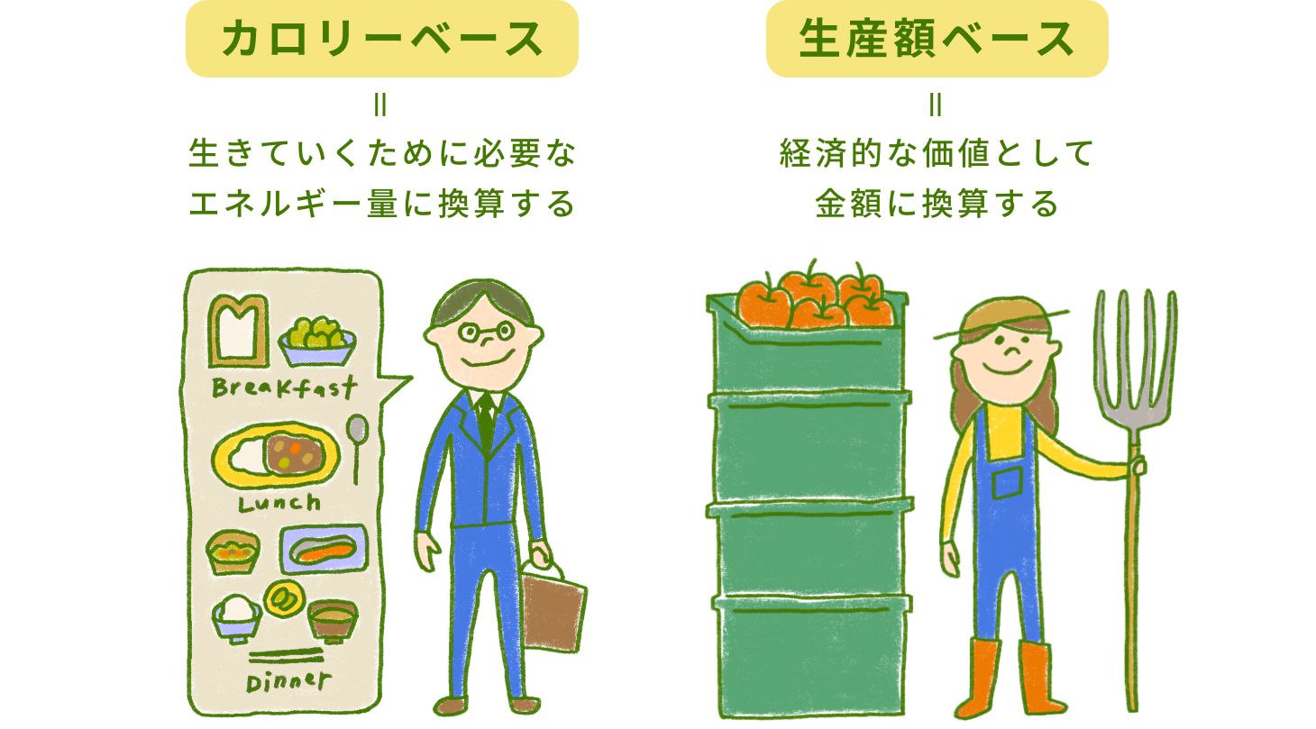 日本では、人が生きていくために必要なエネルギー量に着目してカロリーに換算する方法「カロリーベース」と、経済的な価値に着目して金額に換算する方法「生産額ベース」の二種類の計算方法によって、食料自給率を算出しています。