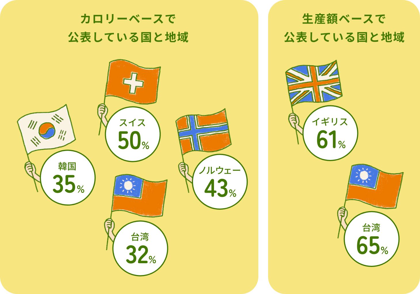日本以外には、スイス、ノルウェー、韓国、台湾がカロリーベースの食料自給率を公表しており、イギリス、台湾が生産額ベースの食料自給率を公表しています。Q1でお答えしたように、食料自給率は輸入の依存度が高い国にとって関心が高い指標であり、これらの国・地域はすべて食料自給率が100パーセントを下回っています。アメリカやオーストラリアのように食料自給率が100パーセントを上回る国は、食料自給率への関心が相対的に低く、特に公表していないものと考えられます。