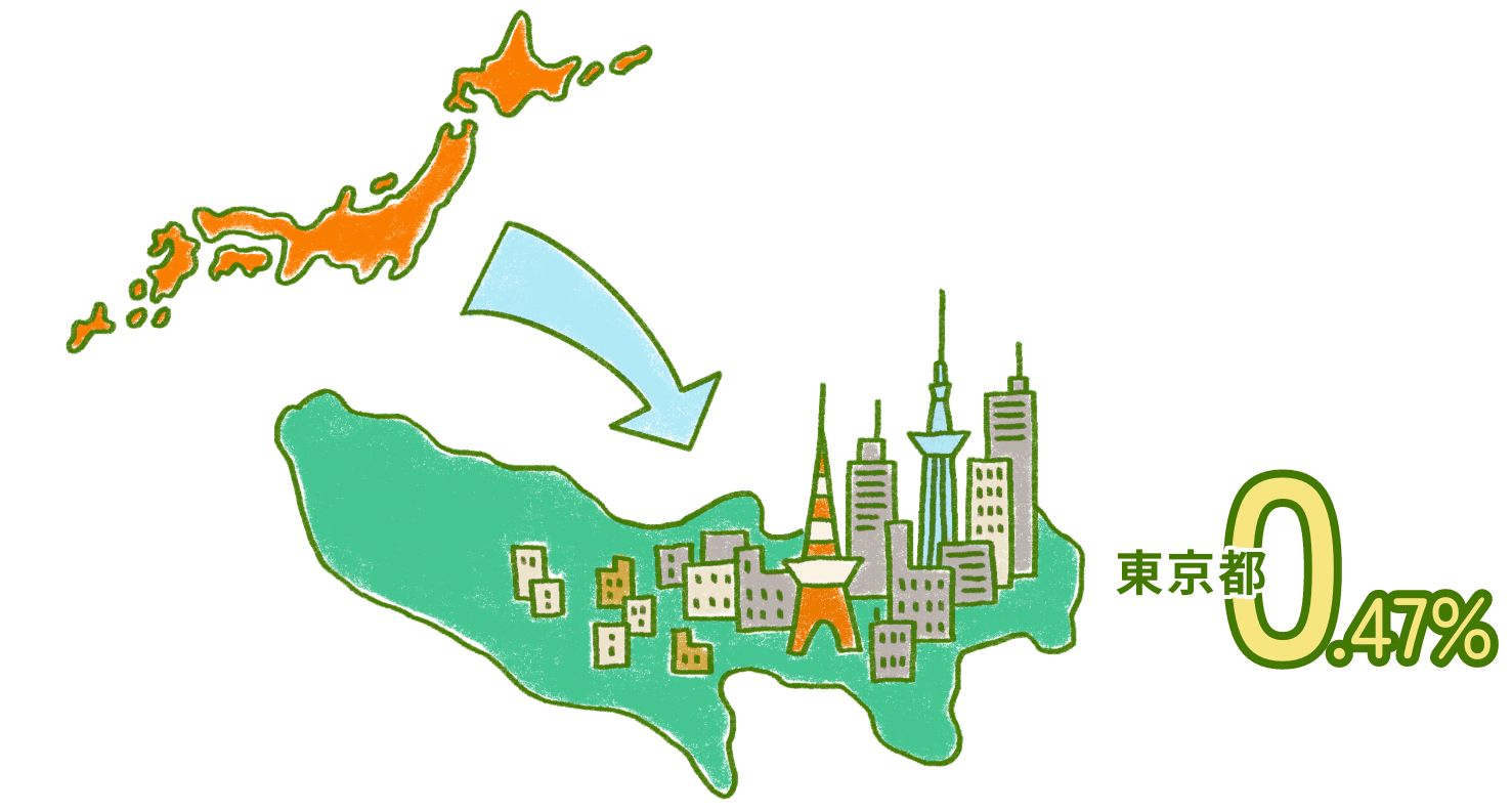 小数点以下を四捨五入して「0パーセント」と公表していますが、小数点以下も表すと0.47パーセントです(カロリーベース)。東京都でも、大消費地に近い利点を生かしながら、野菜や米、畜産、漁業などの農林水産業が行われています。しかしながら、日本の人口の1割以上の約1,400万人が東京都に住んでおり、その食料消費と比べてしまうと生産の割合はごくわずかです。