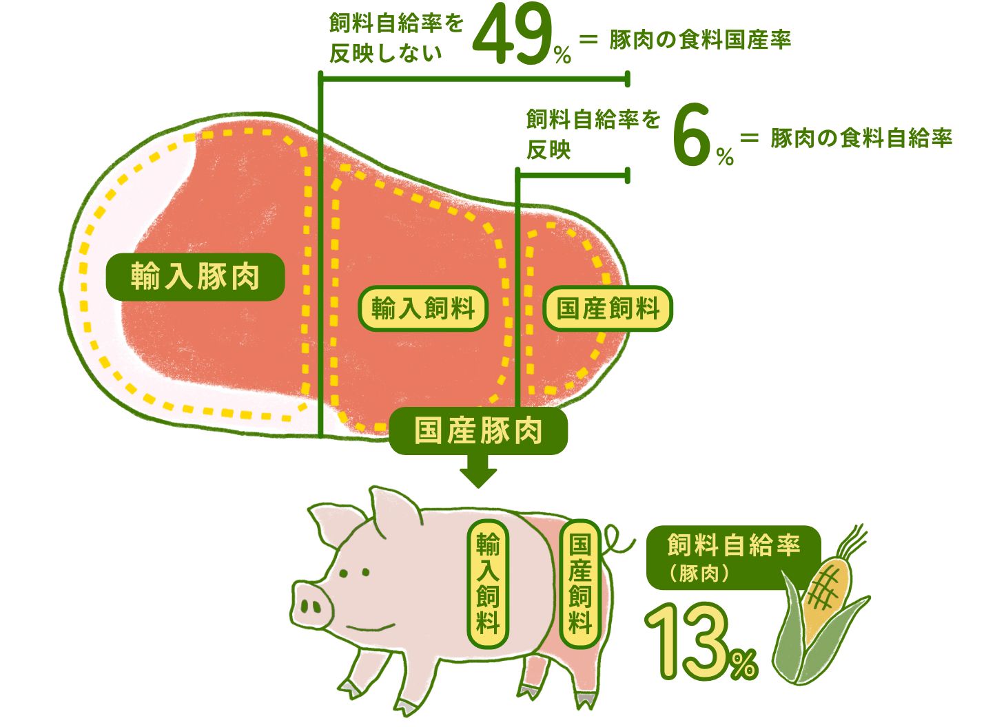 牛肉は約4割、豚肉は約5割、鶏肉は6割から7割が国産ですが、食料自給率の計算においては、牛肉の自給率は10パーセント、豚肉は6パーセント、鶏肉は8パーセントとなっています。肉類の自給率が低いのは、国産であっても輸入飼料による生産相当分は除くこととしているためです。肉類の生産は、とうもろこしなど飼料の多くを海外からの輸入に頼っており、国内で生産されている食料を厳密に評価するという観点から、食料自給率の計算において、肉類など畜産物については、飼料の自給率を考慮して計算しているのです。