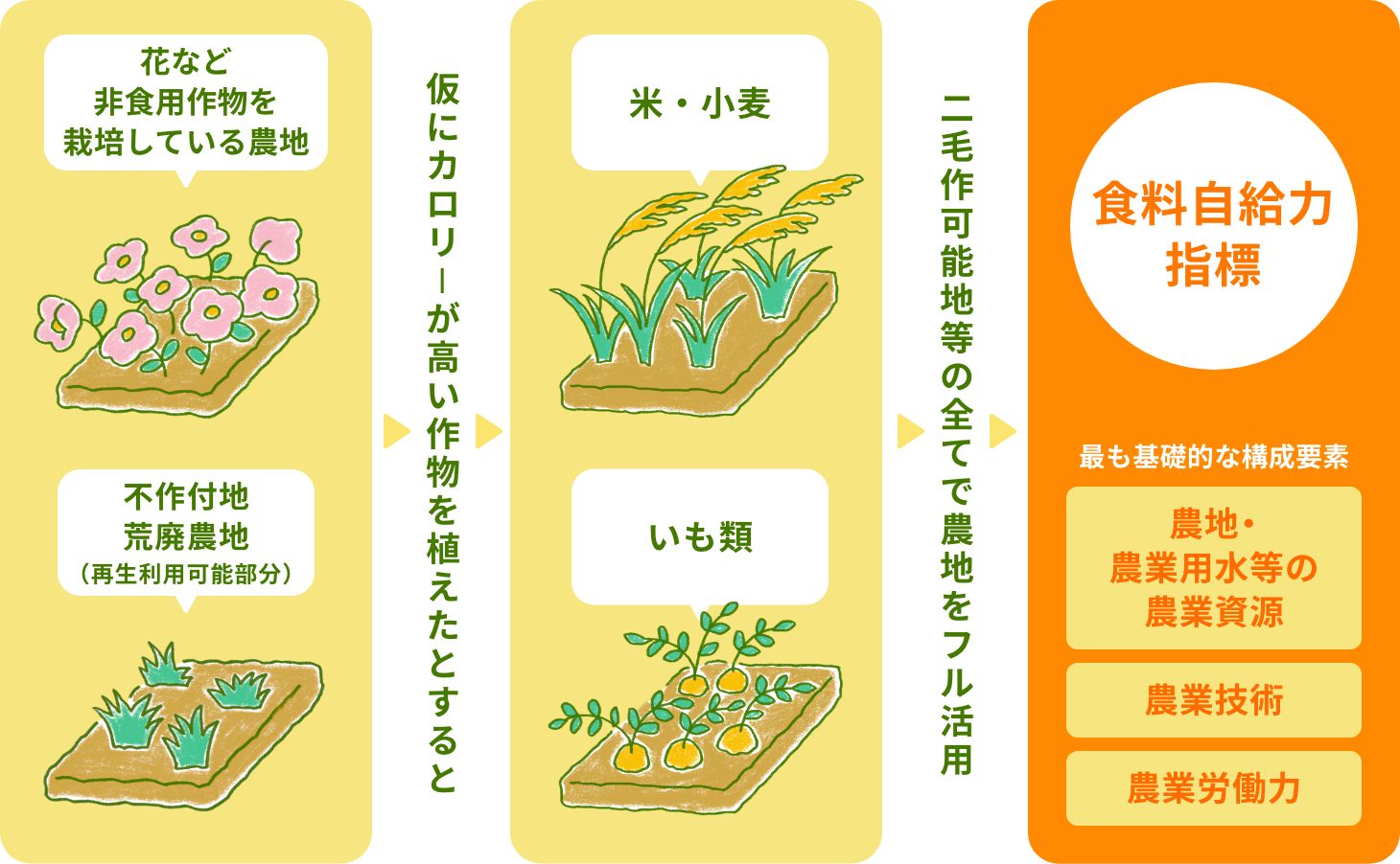 食料生産にはいくつか基本となる要素があります。まず1つめが生産基盤である農地・農業用水などの農業資源、2つめは農業生産を担う農業者、3つめが収量や生産性を向上させる栽培技術や品種改良などの農業技術です。この3つを最大限活用した場合に、どれだけの食料を供給可能か、農林水産省ではそれをカロリーで示したものを「食料自給力指標」として公表しています。カロリーの高いいも類を中心に農地をフル活用すれば、国民の必要カロリーをまかなえるという試算結果となっていますが、これは現在の食生活とはかけ離れており、まさに「生き抜くための食事」です。農地や農業者の減少に伴い、食料自給力指標は長期的に低下しており、農地や農業者を維持・確保することの重要性も示しています。