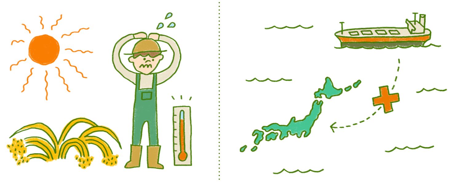 2つめは、食料の生産が水や太陽光など自然環境を利用しているため、異常気象などによって生産量が不安定になる場合があるということです。いざ緊急増産をしようとしても、農産物に適した季節が巡ってこなければ生産することはできません。