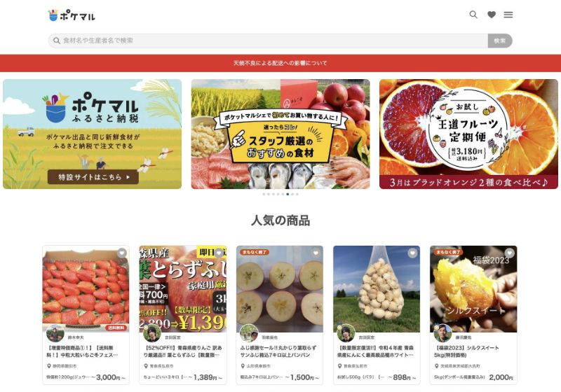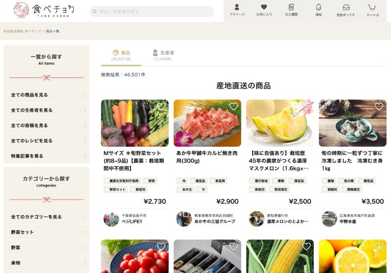 全国の農家や漁師から新鮮な食材を直接購入できるオンライン直売所。約8,000軒の生産者が野菜・果物から肉類、魚介類、加工品から花・植物まで50,000点以上の商品を出品しています。生産者と直接メッセージでやり取りができる機能で食べ方を教えてもらったり、数多く投稿されている口コミを見て商品を選ぶことができます。