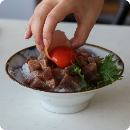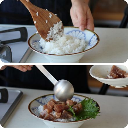 ごはんをよそって、大葉と解凍した本まぐろを汁ごと盛り付けます。