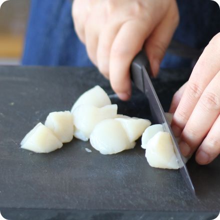 ほたて貝柱は1.5センチメートル角ぐらいに切ります。