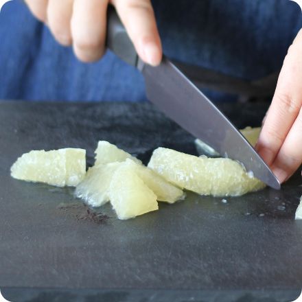 グレープフルーツは皮と薄皮を除いて房取りし、1.5センチメートル角ぐらいに切ります。