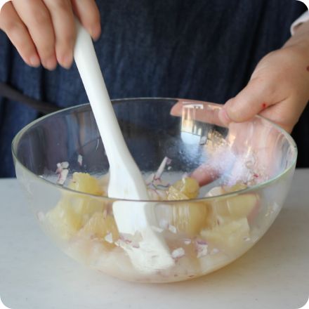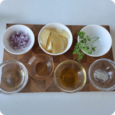 ボウルに[ A ]を入れ、エキストラバージンオリーブオイルを少しずつ加えながら混ぜ、紫玉ねぎを加えて混ぜ合わせ、ドレッシングを作ります。