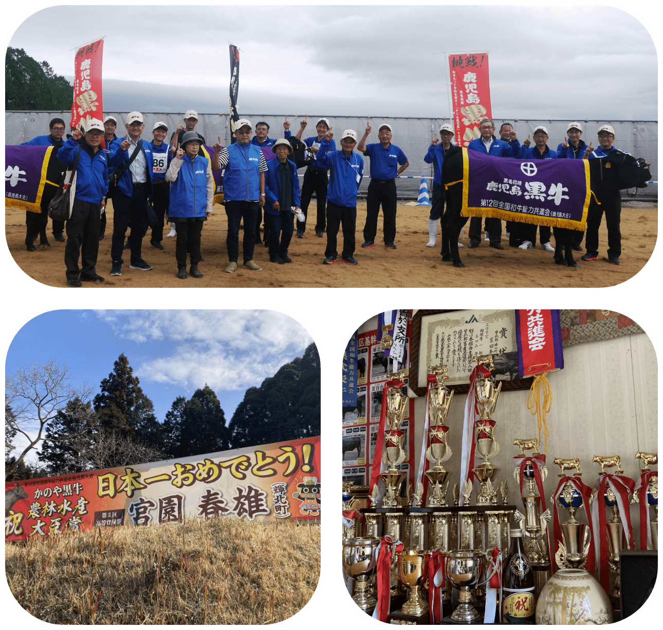 県道に面した宮園さんの自宅敷地には「日本一おめでとう!」の横断幕、土間にはたくさんのトロフィーがずらり。これらは2022年10月に鹿児島県で開催された第12回全国和牛能力共進会での快挙を称えて贈られたもの。5年に1度開催されることから、“和牛の祭典”とも呼ばれている全国和牛能力共進会は、全国から選りすぐられた和牛を一堂に集めて、改良成果を競う大会です。この一大イベントの第5区(高等登録郡)に出品した宮園さんの雌牛たち、こづる・なつみ・さくら(母・子・孫)が首席に選ばれたのです。第5区は、3世代にわたり長所が受け継がれているかなどを審査される出品区。高齢の小規模繁殖農家が育てた3頭が見事日本一になったということで、この受賞はかなり注目を集めました。「特別なことは何もしていません」という宮園さん。昔ながらの育て方が高く評価されたことは、畜産業の生産基盤を支える小規模繁殖農家の方々の大きな励みとなっています。