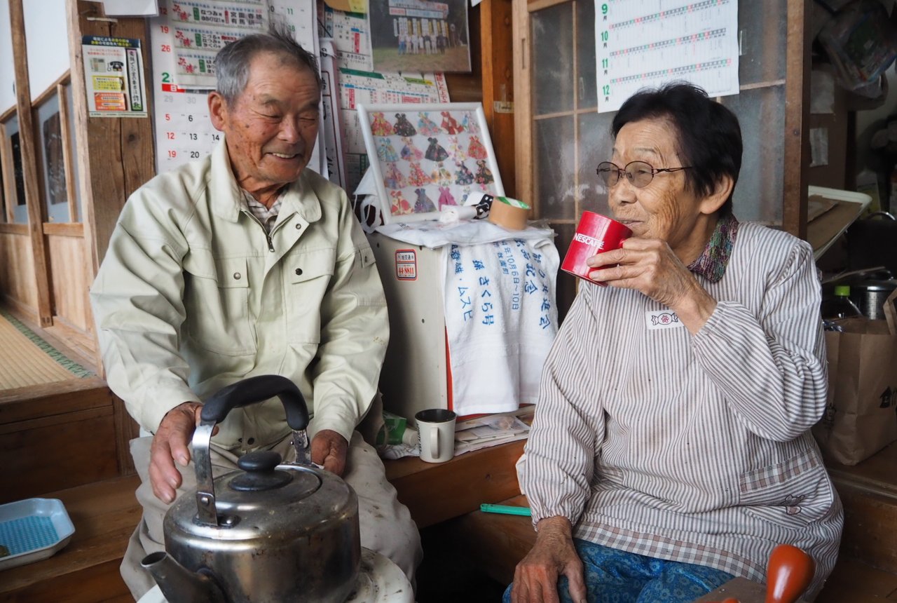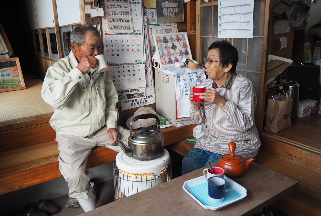 妻のムスビさんと土間で朝一番のお茶を飲みます。お二人は結婚して64年。ずっと一緒に牛飼いや畑仕事をしてきました。かつては麦やさつまいもなどの畑作をメインに行っていましたが、次第に牛の繁殖に力を入れるようになったといいます。「この人は昔から本当に働き者。とにかく仕事さえしていれば幸せというタイプなんですよ」とムスビさん。