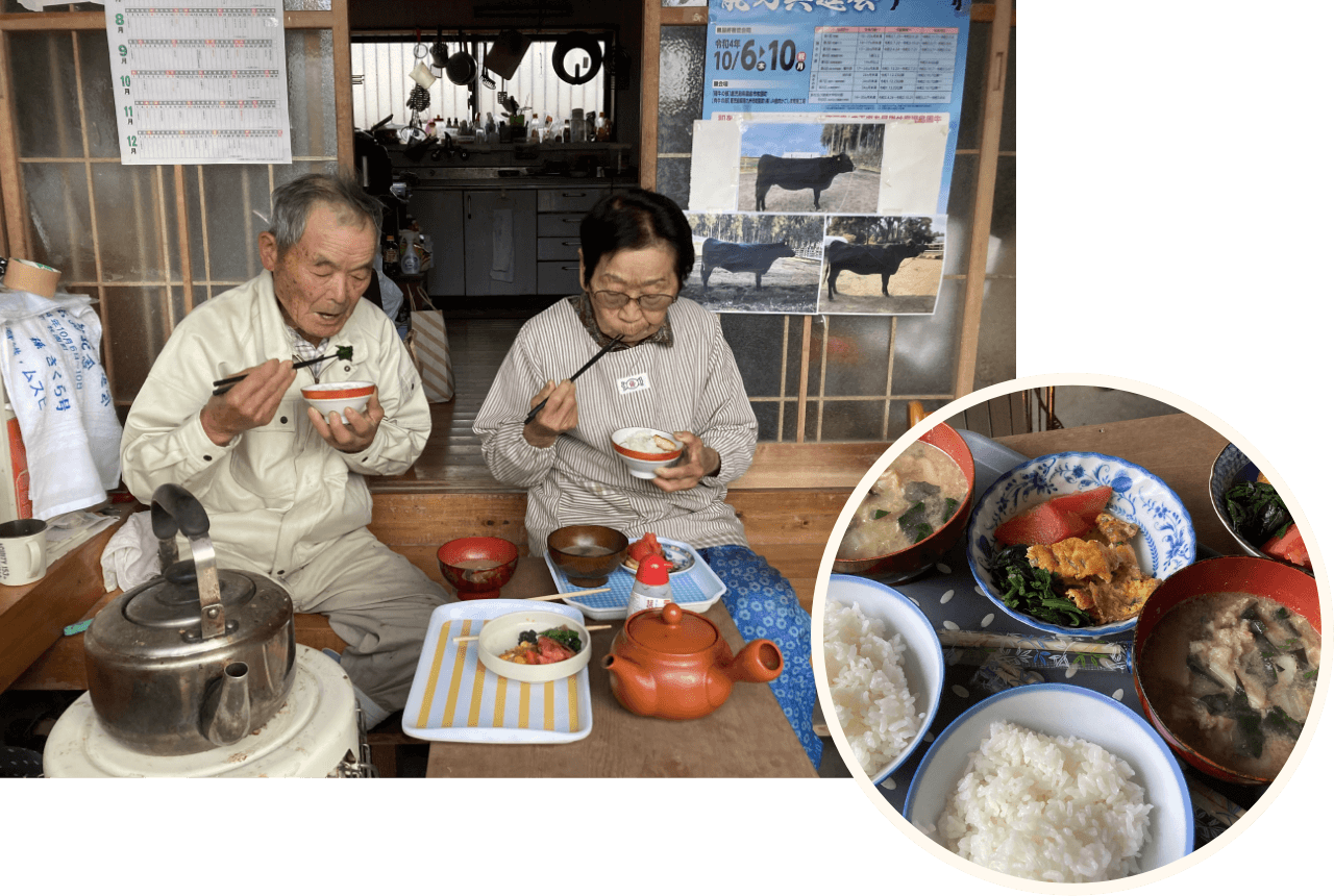 仲良く朝ごはんを食べます。おかずはトマト、ほうれん草のおひたし、卵焼き。お二人の元気の秘訣は、大好きな牛飼いの仕事に加え、ムスビさんが作る日々の食事にもあるのでしょう。