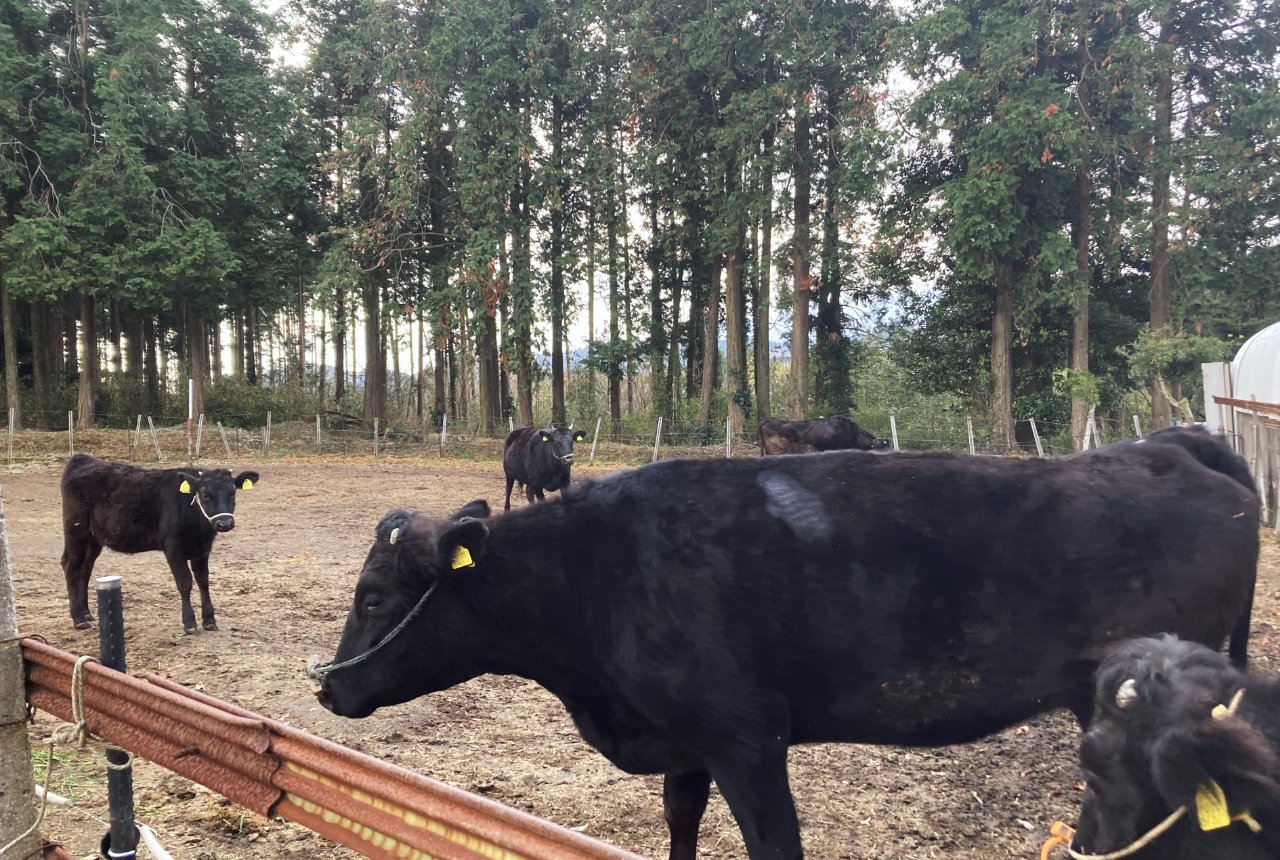 牛たちが向かった先は、裏手のスギ林を通り抜けたところにある運動場。ここで夕方まで、のびのびと自由に遊ぶのです。母牛が元気な子牛を産むためには、できるだけストレスフリーな環境を作ることが大切です。運動不足とは無縁の宮園さんの牛たちは、ストレスが少なく健康そうです。