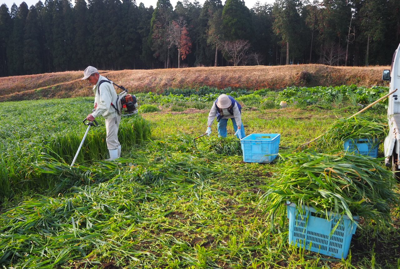 少し離れた飼料畑へ行き、粗飼料に使う青草を刈り集めます。牛たちの好物であり元気の源です。
