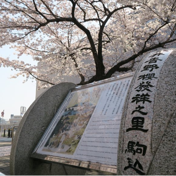JR駒込駅前にある「染井吉野桜記念公園」の記念碑。園内には‘染井吉野’の“親”であるエドヒガンとオオシマザクラが植樹されている。
