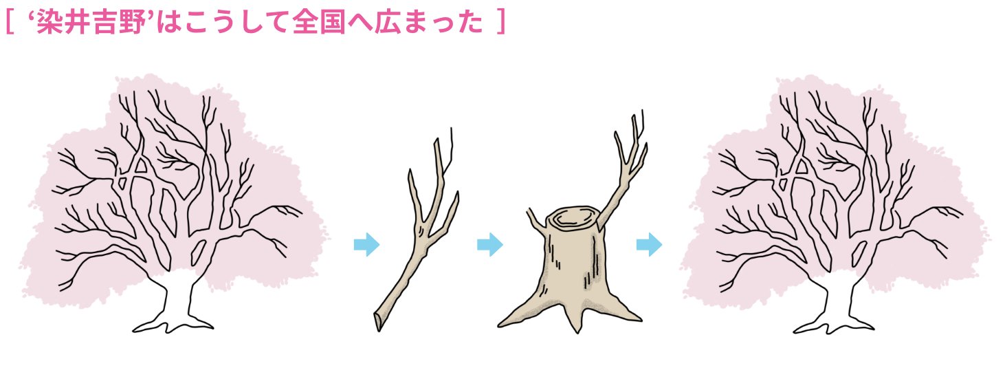「江戸時代の頃、染井村には多くの植木職人が住んでいて、そこで接ぎ木苗が作られていたと考えられます。増殖した‘染井吉野’の接ぎ木苗は初期成長が早く、また、大きく美しい花が多くつくことがわかり、さらに各地へと広まっていったのでしょう」(勝木先生)。