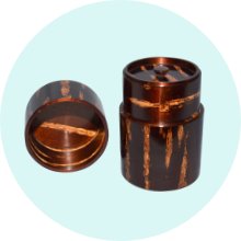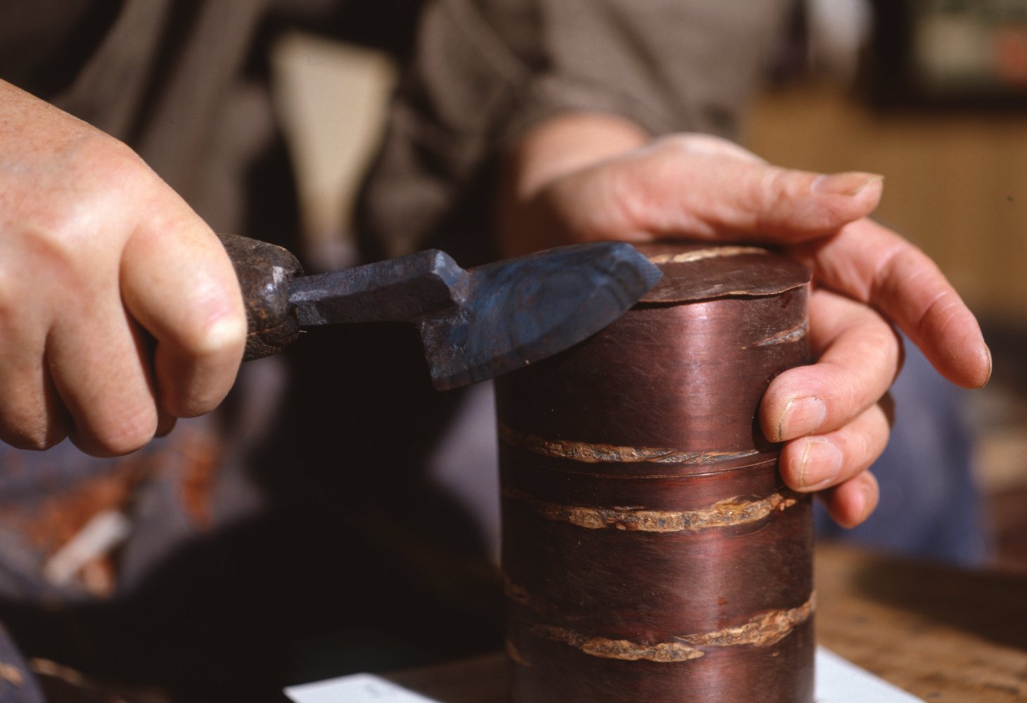 木型に合わせて芯を作り、その芯に膠(にかわ)で樺を貼り付け筒状にする製法です。古くは印籠などに用いられましたが、現在では茶筒が代表的な製品となります。