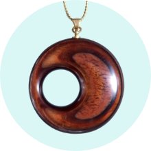 磨いた樹皮を数十枚重ね貼りした塊を彫刻で削り出す製法です。現在ではブローチやペンダント、ループタイ等のアクセサリーが作られています。樹皮断面の層や磨き上げられた光沢が魅力です。