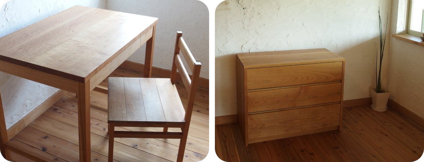 左上 :ヤマザクラで作られたデスクとチェア。 右下 :チェスト。穏やかな木目と艶のある質感、そして滑らかな手触りに温もりを感じる。