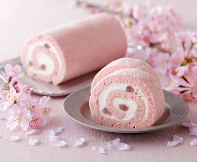 桜風味の生地とクリームで桜餡を巻いて仕上げた、見た目も味も桜満開のロールケーキ。