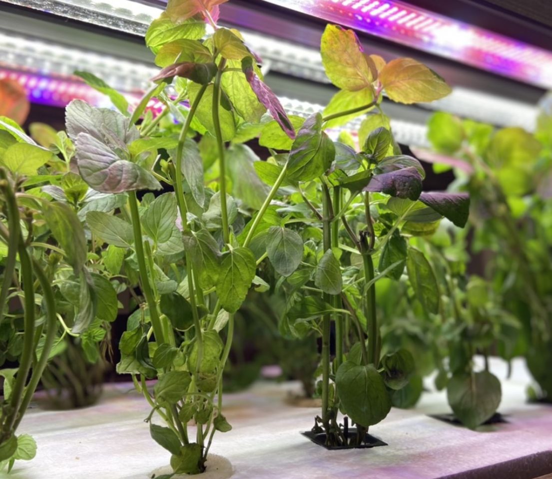 ラボではこうした研究や提案を行いながら、実際にさまざまな作物を育てています。ミントやバジルの栽培ルームに入ると、爽やかな香りに包まれます。青々とした葉はみずみずしく、培養液が流れる音は、まるで川のせせらぎのよう。室内型水耕栽培は、作物がすくすくと成長するさまを間近で楽しめるのが醍醐味です。収穫したものはオンラインで販売したり、近隣の方々に直販したりしています。地域の道の駅に卸すこともあり、インスタグラムで時折、収穫の情報発信をしています。