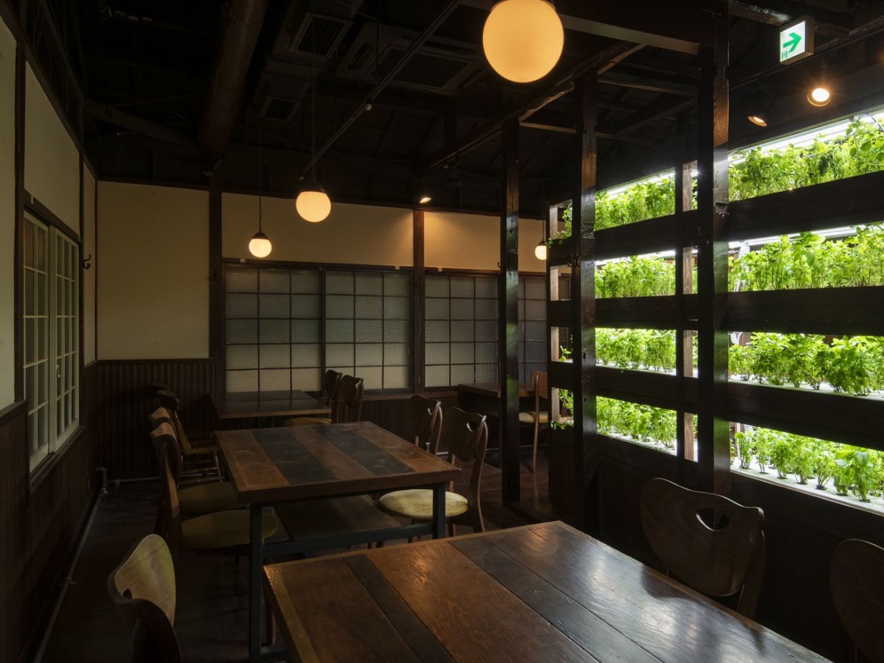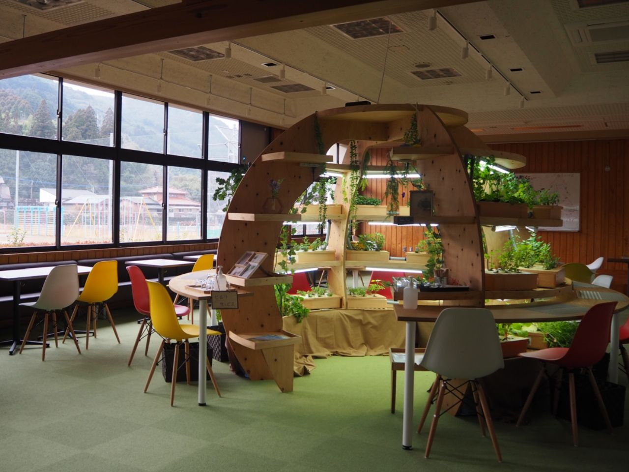 2022年9月には校舎内にカフェをオープン。水耕栽培のハーブやいちごはもちろんのこと、近隣農家の野菜なども使った地産地消メニューを提供しています。施設のすぐ向かいに保育園と学童保育施設があるため、子連れで遊びに来てくれる方々が多いとか。地域の集まりにもよく利用されています。店内中央には球体の大きな水耕栽培ユニットを設置。間もなくメダカの水槽と組み合わせて、魚と植物を同じシステムで育てるアクアポニックスを試みる予定です。