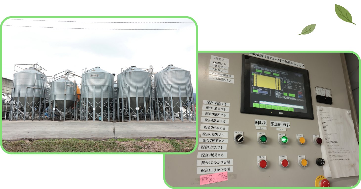 豚舎の横に並ぶ飼料米やとうもろこしなどの飼料貯蔵タンク。右は妊娠期、授乳期、肥育期など、飼育状況に合わせて飼料配合を行う制御システム