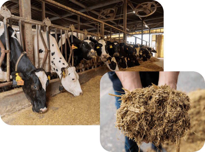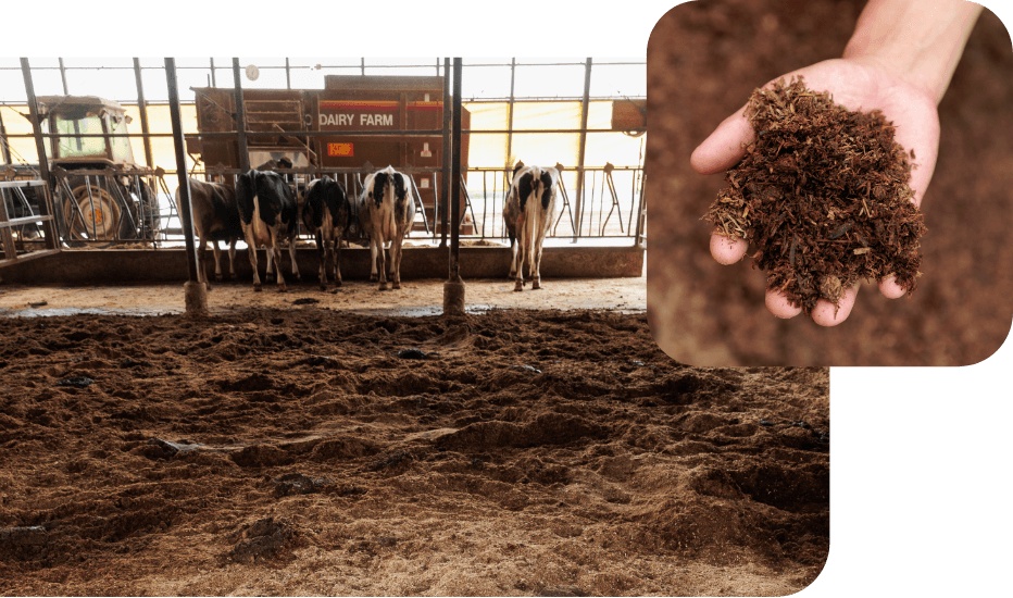 腸内環境が整えられた牛から排泄される糞は、不快な便臭が抑えられています。この糞を、おがくずやもみがらと混ぜ合わせて数カ月寝かせて堆肥を作ります。するとさらにニオイの物質が分解されるため、牛舎の敷料として活用することで牛たちのストレスを最小限にすることができます。また堆肥は地域の農家で肥料としても使われて、耕畜連携の循環を生み出しています。