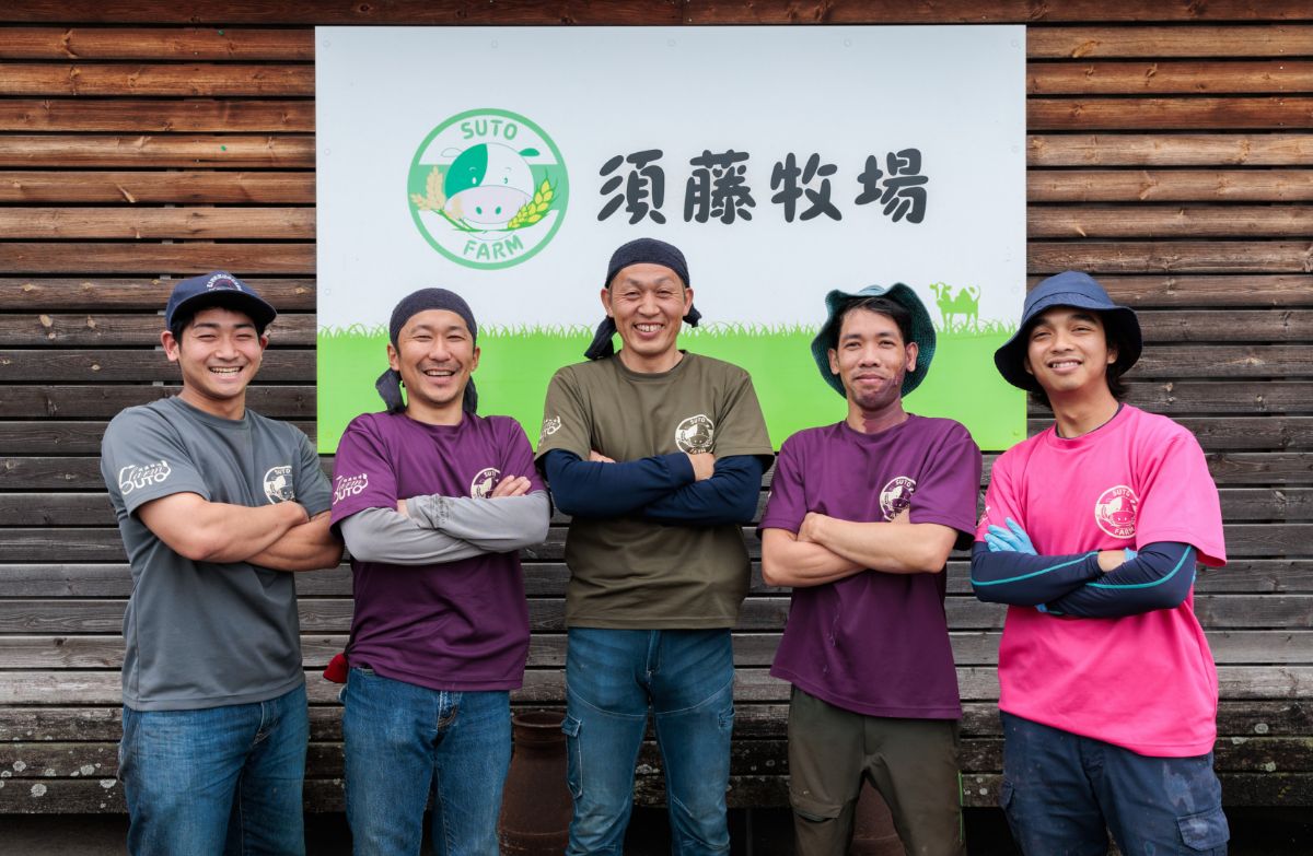 須藤牧場のスタッフの皆さん。須藤さんの左が熊川農場長で、その左が新人スタッフの新井さん。この2人が将来的に牧場を継承する予定です。
