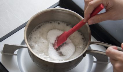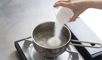 グラニュー糖は必ず粉寒天が溶けてから加える。溶ける前に入れると固まりにくくなる。