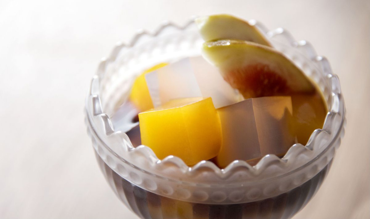 透明和菓子に欠かせない材料が、海藻由来の寒天。その弾力ある食感を存分に楽しめるメニューがあんみつです。半透明な寒天だけでなく、みかんジュースを加えた黄色い寒天も作って酸味と華やかさをプラス。仕上げにかける黒蜜にはバルサミコ酢を加え、ほんのり甘酸っぱい風味に。昔ながらのあんみつとはひと味違う新感覚のおいしさです。和食だけでなく洋食後のデザートにもぜひどうぞ。