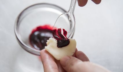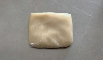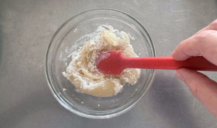 ❶の耐熱ボウルにラップをかけ、600ワットの電子レンジで30秒加熱する。電子レンジから取り出して再び混ぜ、生地をラップに包んで冷ます。