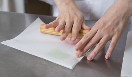 ❸の赤生地と緑生地をそれぞれオーブンペーパーにはさみ、麺棒で2ミリメートル厚に伸ばす。