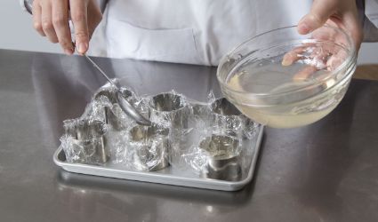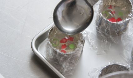 各セルクル型にラップを敷き、それぞれに❽を大さじ2ずつ流し入れる。