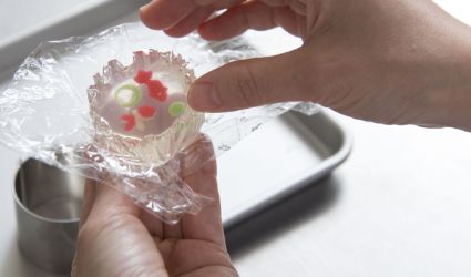 まるで澄んだ水の中を金魚が優雅に泳ぎ回っているよう。夏の風物詩である金魚は、季節感を表現するのにぴったりのモチーフ。こなし生地※に色を付け、抜き型で抜いて作ります。寒天の透明度が高いのは、グラニュー糖を多めに入れているから。寒天は砂糖の量が多いほど透明になります。最後にレモン汁を加えるので、仕上がりはあくまでさっぱり爽やか。ラップを敷いた型で固めるだけで、寒天のふちがアートのようにランダムなギザギザになります。