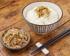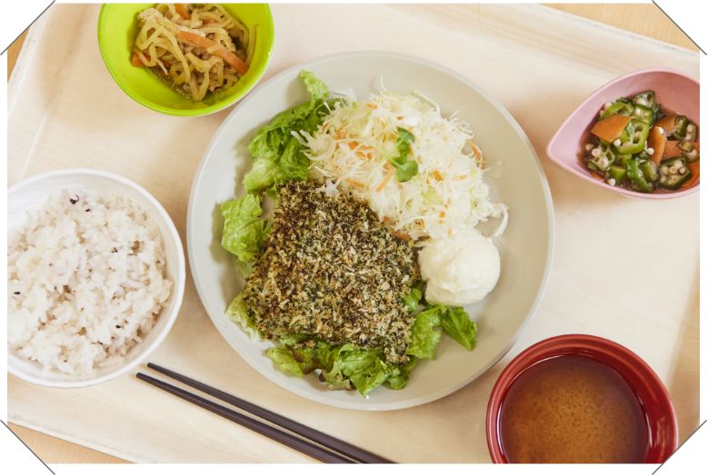 淡白で上品な味わいの白身魚を、パセリなどの香草とパン粉をのせてふわっと焼き上げたもの。味付けはコンソメで塩分控えめ。香草とオリーブオイルで香り付けした洋風の魚メニューです。オクラのナムル、切り干し大根と油揚げの煮物の小鉢付き。十五穀米のごはんはお粥に変更することもできます。(680円)